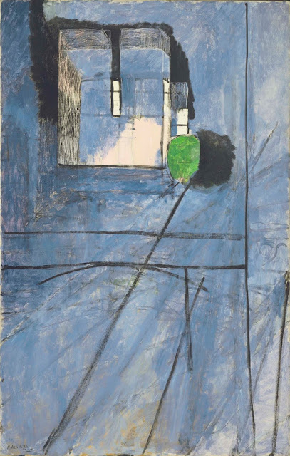 Rustic flowers in a vintage cream ceramic container sit in front of a black and white photo by San Francisco artist Durwood Zedd. |