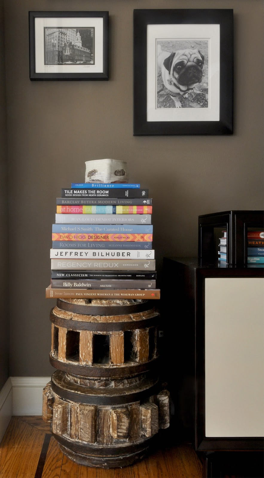 A vintage wooden cog and gear from Ohmega Salvage in Berkeley becomes a perch for a stack of favorite design books. |
